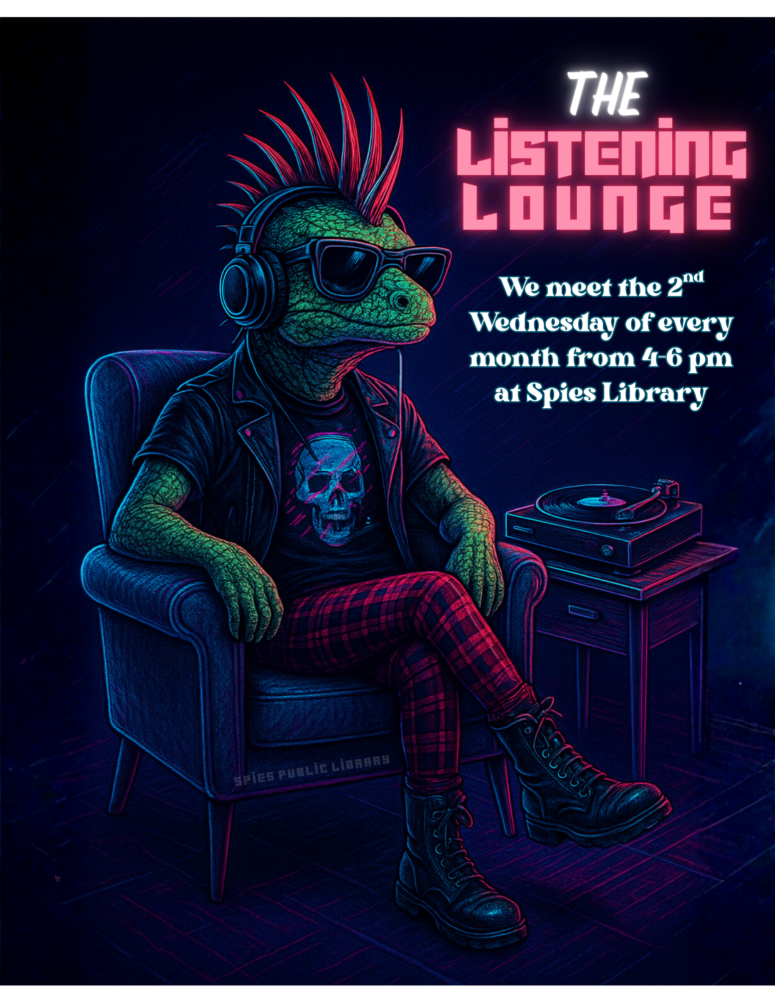 The club is open to the public, though borrowing from the library’s collection requires a Spies Library card. We meet once a month (The second Wednesday of every month from 4-6 pm) to share our thoughts, experiences, and celebrate great music together.